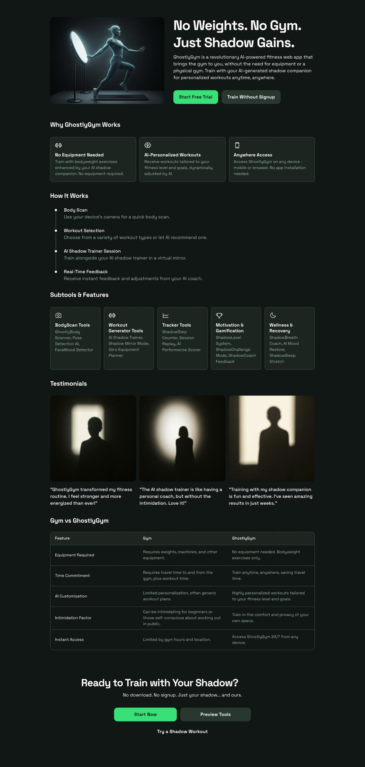 GhostlyGym is your AI-powered, gym-free spiritual fitness companion. It blends guided ghost workouts, breath rituals, posture corrections, and mood-mapping â all without equipment. Just you, your energy, and ghostly AI support.